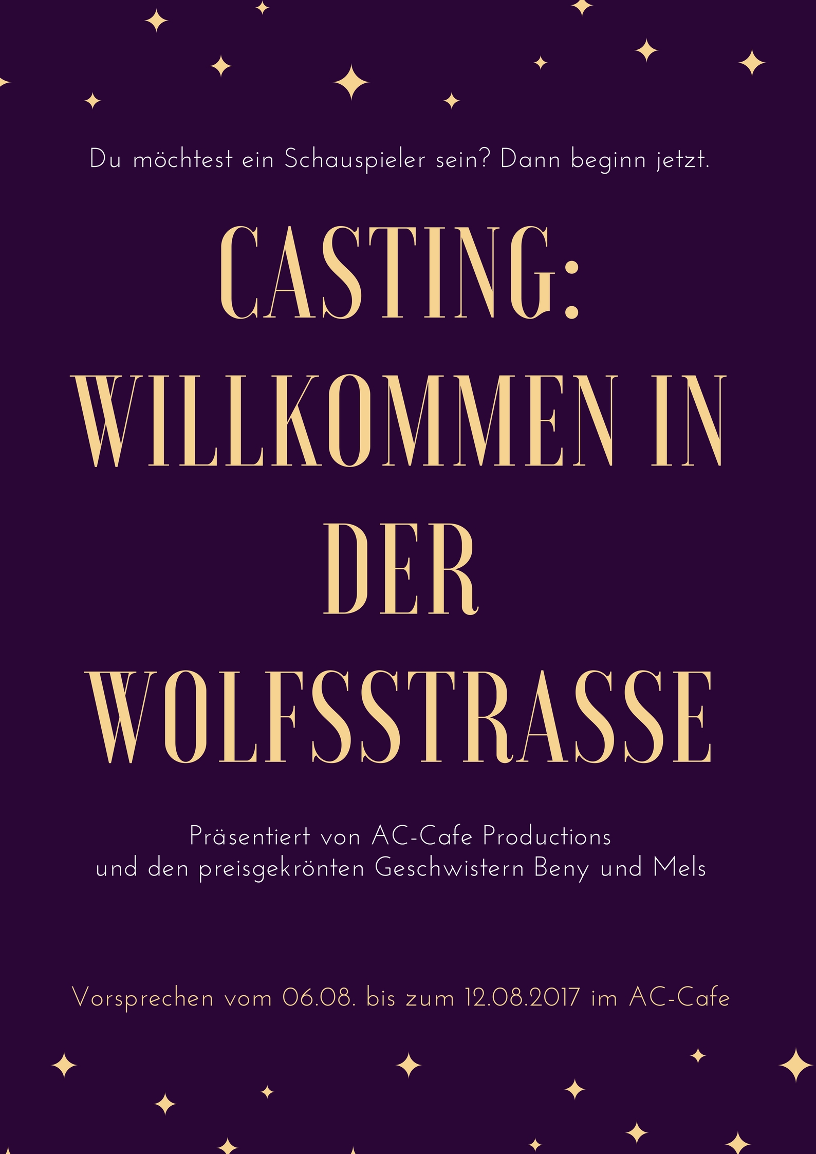 • Es war ein angenehmer Tag in den Tiefen des Deutschösilandes, doch auch die Sonnenstrahlen, die sich durch die Vorhänge in den kargen Raum schlichen, heiterten die beiden Gestalten, die an einem runden Tisch kauerten, nicht auf.„Wir sind sowas von pleite.“, seufzte Beny. Missmutig stimmte ihm die junge Frau gegenüber mit einem Nicken zu. So hatte sie sich ihr Leben in der Welt des Theaters und der Musicals nicht vorgestellt. Sie beide hatten Bühnenerfahrung und Kritiker lobten ihr Talent in so vielen Zeitschriften und Zeitungen. Kaum hatten sie sich aber von ihrer Agentur losgesagt, die sie nur ausnutzte und mehr als die Hälfte des Gewinns für sich selbst beanspruchte, lief alles bergab. Keiner buchte sie für Dramen und nicht einmal für Musicals schien sich jemand für sie zu begeistern. Nur weil die Agentur so dreist war und sie in einem schlechten Licht darstellte. Sie seien „egoistische überhebliche D-Prominenz:“ Dabei waren sie immer so lieb gewesen. Zu lieb. Was sollten sie tun? Mels, die junge Frau, schien eine Idee zu haben.„Vielleicht sollten wir unseren Blickwinkel ändern @Beny. Wie oft hast du schon erwähnt, dass du gerne mal Regie führen würdest und andere dazu erheitern ihre schauspielerischen Fähigkeiten aus den Tiefen der Seele an die Oberfläche zu bringen. Wir sollten unser eigenes Stück aufführen. Und ich weiß auch schon was: Willkommen in der Wolfsstraße!“